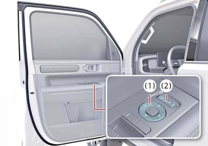 미러 조절 선택 스위치(2)를 오른쪽(R)으로 미십시오. 미러 조절 스위치(1) '▶'부분을 눌러 실외 미러를 조절하십시오.