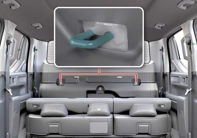 어린이 보조 시트를 고정할 수 있는 상부 부착구(후크 고정용)가 뒷좌석 등받이 뒷부분에 위치해 있습니다.