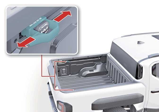 화물 적재 시 베드 고리 또는 고정된 클릿에 화물을 단단히 고정하여 주행 중 움직이지 않도록 하십시오. 화물을 제대로 고정하지 않으면 주행 중 또는 정차 시 차량 밖으로 튕겨져 나갈 수 있어 매우 위험합니다.
