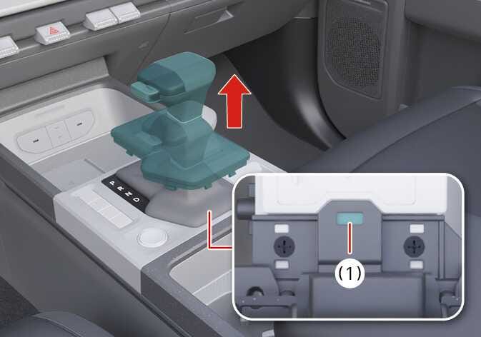 그래도 변속 레버가 움직이지 않으면, 변속 레버 부츠를 당겨 센터 콘솔에서 분리한 다음, 레버 로드 뒤쪽에 위치한 흰색 버튼(1)을 비상 키 또는 뾰족한 공구를 사용하여 누른 상태에서 N(중립) 위치로 변경합니다.