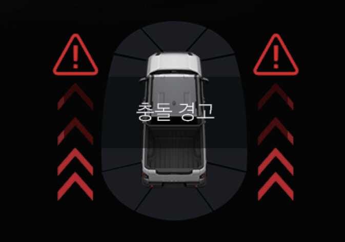 실외 미러(사이드 미러) 경고등이 깜빡이고 경고문과 경고음을 통해 충돌 경고를 알립니다.