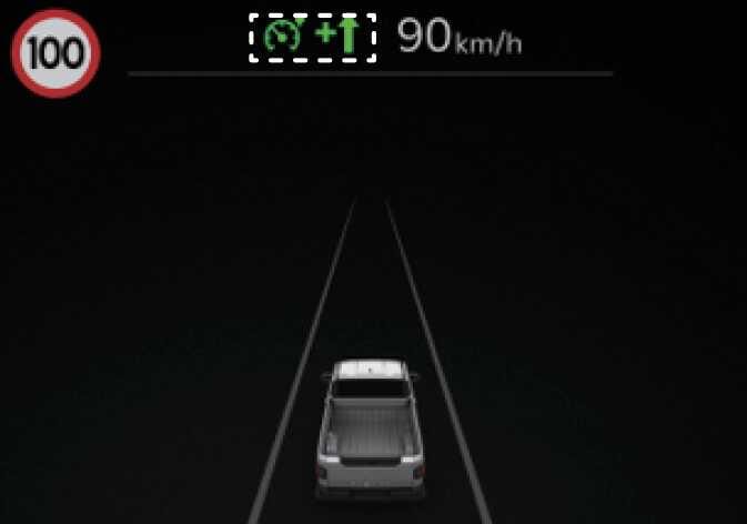 수동 속도 제한 보조 또는 스마트 크루즈 컨트롤 작동 시, 운전자가 설정속도를 도로의 제한속도에 맞추면 자동 설정속도 조절 기능이 활성화되며 클러스터의 설정속도가 초록색으로 표시됩니다. 이후 제한속도가 변경되면 여기에 맞춰 자동으로 설정속도를 조절해 줍니다. |