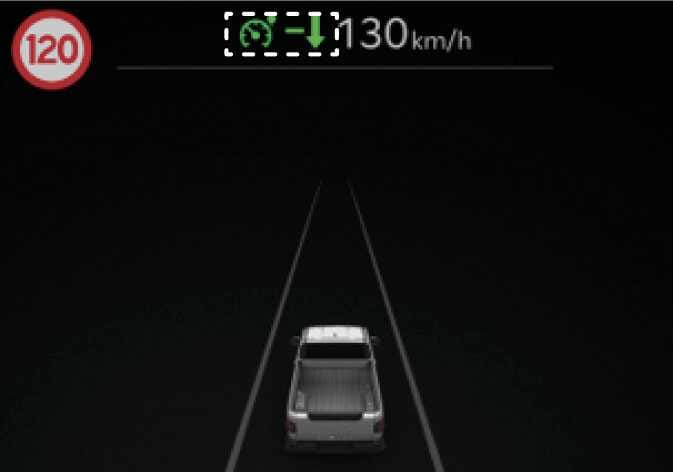 수동 속도 제한 보조 또는 스마트 크루즈 컨트롤이 작동하는 중에 도로의 제한속도가 변경되면 위 또는 아래 방향의 화살표를 표시하여 설정속도 변경이 필요함을 알립니다. 이때 화살표 방향으로