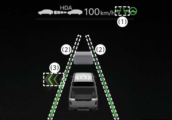 방향지시등 스위치를 (2)에 두면 고속도로 차로변경 보조기능을 수행합니다. 이후에는 방향지시등 스위치가 중앙(1)으로 돌아가더라도 계속해서 차로변경을 도와줍니다.