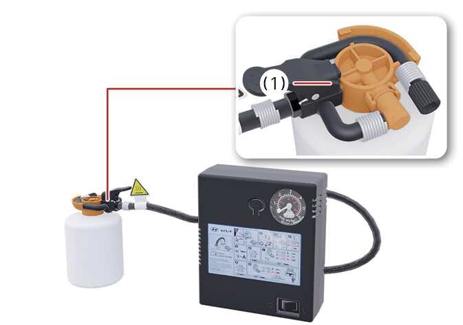 컴프레서 측 주입 호스를 실런트 용기 주입 호스 연결부에 연결하여 고정하십시오(1). 실런트 용기를 주입 호스가 위를 향하도록 세워 두십시오.