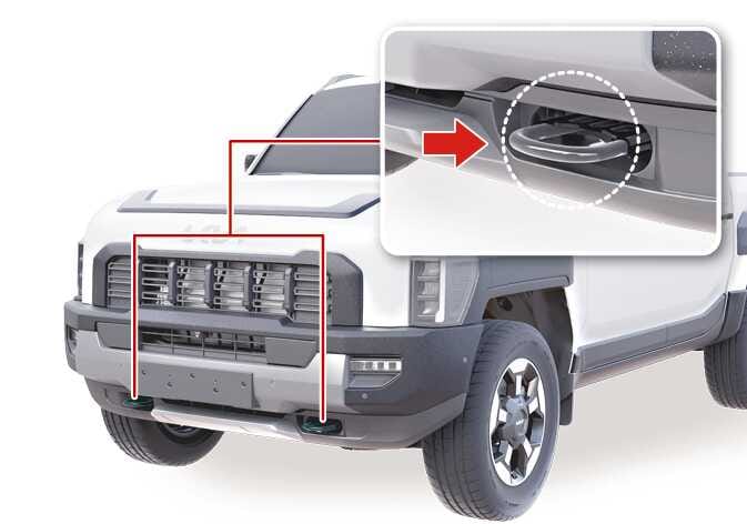 차량 전방에 위치한 견인 후크를 사용할 경우 양쪽 모두 사용하십시오.