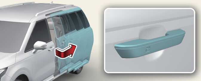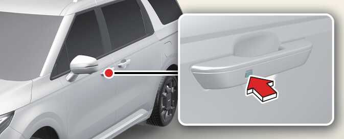 모든 도어(테일게이트 포함)가 닫히고 잠긴 상태에서 실외 도어 손잡이를 당기거나 도어 손잡이 버튼을 누르면 모든 도어가 잠금 해제되고, 해당 도어가 자동으로 열립니다. (사양 적용시)