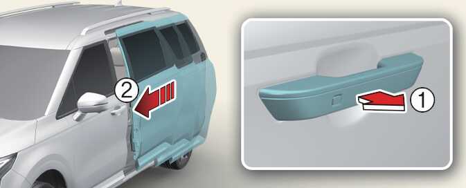 도어가 잠금 해제된 상태에서 실외 도어 손잡이를 당긴 후 차량의 뒤쪽 방향으로 밀면 도어를 열 수 있습니다.
