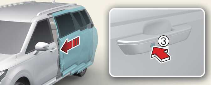 파워 슬라이딩 도어를 닫을 때는 실외 도어 손잡이(1)를 당기거나 실외 도어 손잡이 버튼(3)을 누르면, 도어가 자동으로 닫힙니다(2). (사양 적용시)