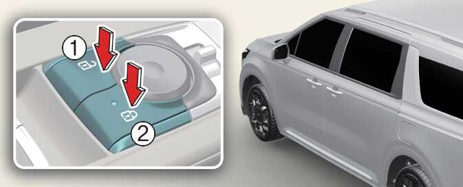 중앙 도어 잠금(2)/잠금 해제(1) 스위치를 이용하면 모든 도어가 잠금/해제됩니다.