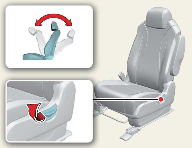 앞쪽 또는 뒤쪽 조절 스위치를 누르면 등받이 각도가 앞 또는 뒤로 조절됩니다. 원하는 위치에 이르면 스위치에서 손을 떼십시오.