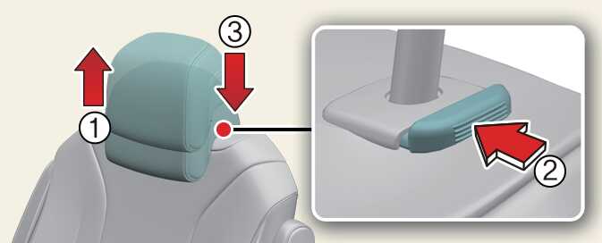 헤드레스트를 높이려면 헤드레스트를 잡고 잠기는 위치까지 위로 당겨 올리십시오(1). 헤드레스트를 낮추려면, 잠금 해제 버튼을 누른 상태에서(2) 헤드레스트를 위에서 누르십시오(3).