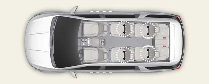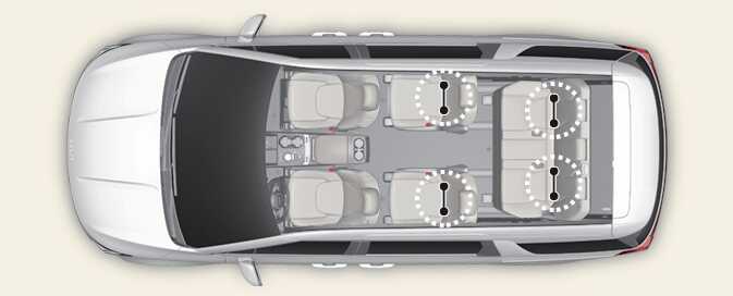 이러한 어린이 보조 시트에는 차량 내 2, 3열 시트 하부(9인승)에 위치한 두 개의 부착구에 연결하는 두 개의 고정부와 상부 부착구를 연결하는 띠 장치를 포함하고 있습니다.