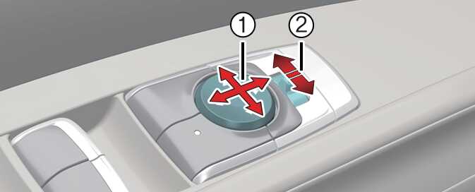 미러 조절 선택 스위치(1)를 오른쪽(R)으로 미십시오. 미러 조절 스위치(2) '▶' 부분을 눌러 실외 미러를 조절하십시오.