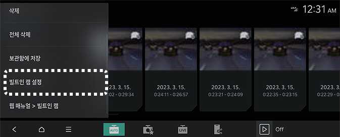 설정 방법 OMQ4H033002 인포테인먼트 시스템 홈 화면에서 빌트인 캠을 선택한 후, 빌트인 캠 설정 메뉴를 선택하십시오. 빌트인 캠 녹화를 포함하여 작동과 관련된 다양한 항목을 설정할 수 있습니다.