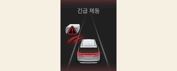 긴급 제동에 의한 정차 시 클러스터 등에 경고문이 표시됩니다. 안전을 위해 즉시 브레이크 페달을 밟고, 주변 상황을 확인하십시오.