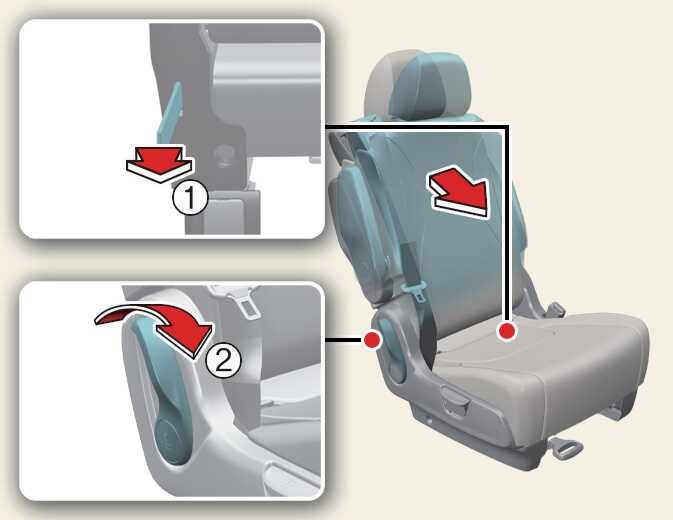 승객이 3열 좌석에서 나올 때 2열 좌석의 워크인 스트랩(1)을 당기거나 워크인 레버(2)를 당기십시오.