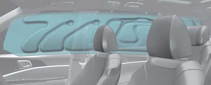 커튼 에어백은 양쪽 도어 위쪽의 천장 끝에 내장되어 있습니다. 에어백 작동 조건이 되면 앞좌석과 뒷좌석 도어 쪽 탑승자의 머리를 보호하기 위해 작동합니다.