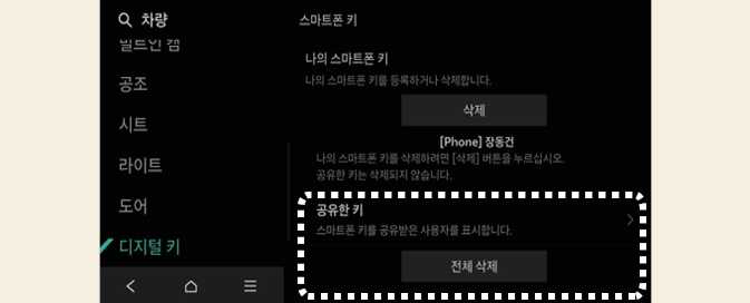 스마트폰에서 디지털 키 2를 삭제하면 차량에 등록된 디지털 키 2(스마트폰)도 삭제됩니다.