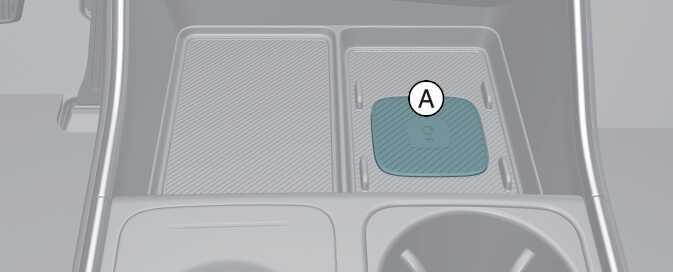 차량 시동이 「ON」 상태에서 등록하려는 카드 키를 실내 인증 패드(무선 충전 패드)(A)에 올려 놓고 인포테인먼트 시스템에서 설정 → 차량 → 디지털 키 → NFC 카드 키 → 등록을 선택하여 카드 키를 등록하십시오.