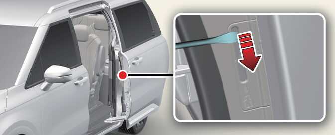 슬라이딩 도어를 열 때는 차 밖에서 실외 도어 손잡이를 사용하여 도어를 여십시오.