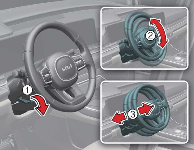 앞뒤 조절을 할 때는 조절 레버를 아래로 당겨 내린 상태(1)에서 스티어링 휠을 앞뒤(3)로 조절하십시오. 조절 후 조절 레버는 위로 올려 원위치한 다음 스티어링 휠이 고정되었는지 확인하십시오. 반드시 운전 전에 조절하십시오.