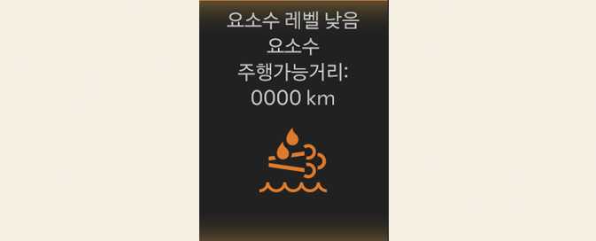 요소수 레벨 낮음(디젤 차량) 요소수가 부족할 경우 해당 메시지를 표시합니다. 요소수 관련 경고 관련 사항은 요소수 시스템(디젤 엔진)(SCR: Selective Catalytic Reduction)의 내용을 참고하십시오. OMQ4033134