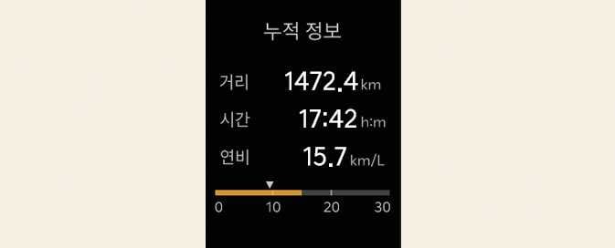 주행 거리/연비/시간 초기화 시점부터 현재까지의 누적 정보를 표시합니다.