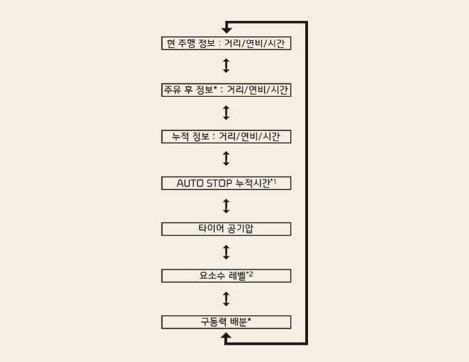LCD 표시창에서 트립 컴퓨터 모드 진입 후, 조작 버튼으로 트립 모드를 변경할 수 있습니다.