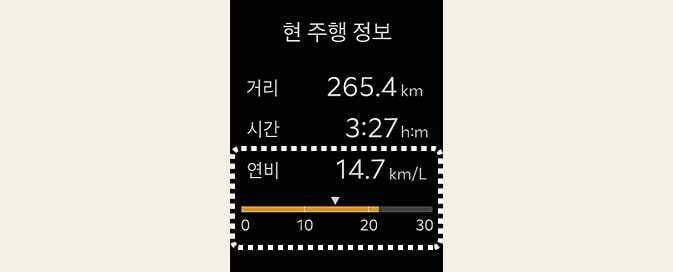 평균연비 초기화(--.- km/L) 시점부터 현재까지의 주행 거리와 연료 소모량을 누적 계산하여 평균연비를 표시합니다.
