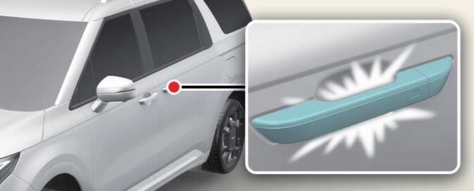 인포테인먼트 시스템의 설정 메뉴에서 웰컴 미러/라이트의 운전자 접근 시가 설정되어 있을 경우 스마트 키를 휴대하고 실외 도어 손잡이에 1 m 이내 접근하면 켜집니다.