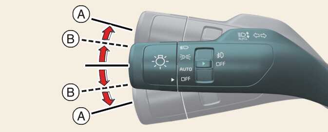 차량의 이동 방향을 예고할 때 사용하십시오. 우측 방향을 표시하려면 조명 스위치를 위(A)로 좌측 방향을 표시하려면 아래(A)로 움직이십시오.