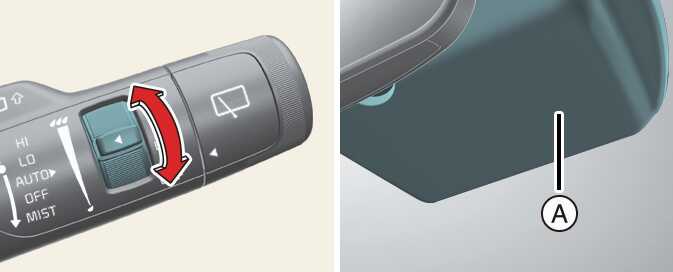 AUTO(사양 적용 시): 차 안 중앙 앞유리 상단에 설치된 센서(A)에서 비의 양을 감지하여 비의 양이 많아지면 와이퍼 작동 속도가 빨라지고, 비의 양이 적어지면 느려지다가 비가 멈추면 작동도 멈춥니다. 와이퍼 속도는 속도 조절 노브(B)를 돌려 조절할 수 있습니다. 위쪽으로 돌리면 속도가 빨라지고 아래쪽으로 돌리면 속도가 느려집니다.