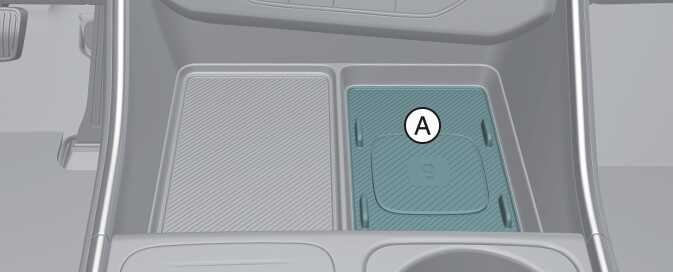 중앙 콘솔 앞쪽에 스마트폰 무선 충전을 위한 시스템이 적용되어 있습니다. 스마트폰을 충전하기 위해서는 차량의 도어를 모두 닫고 시동 버튼 「ON」 상태에서 무선 충전이 지원되는 스마트폰을 충전 패드(A) 위에 올려놓으십시오.