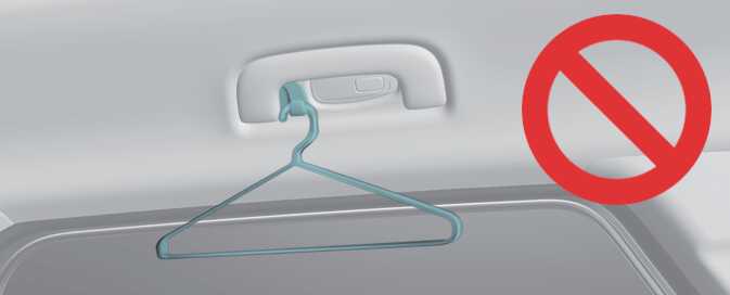 코트 후크에는 옷 이외의 다른 물건(옷걸이 및 단단하거나 날카롭거나 깨지기 쉬운 물건 등)은 걸지 마십시오. 충돌 및 커튼 에어백 전개 시 이 물건들은 발사체가 되어 차량 손상뿐만 아니라 탑승자의 부상이나 사망을 초래할 수 있습니다.