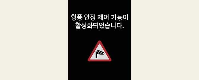 횡풍 안정 제어 기능은 운전자를 위한 보조 시스템으로 차량 안전 및 통제는 운전자 스스로의 판단에 의해 이루어져야 합니다. 항상 스티어링 휠을 확실하게 잡고 안전한 주행을 해야 하며, 필요하면 브레이크 페달을 밟아 속도를 줄이십시오.