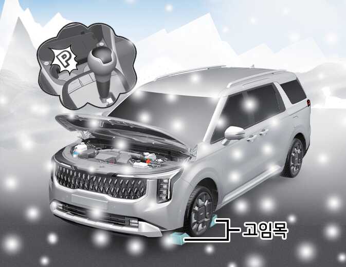 매우 추운 날씨의 주정차 시 주차 브레이크를 작동해 놓으면 브레이크 장치가 얼어 붙어버릴 우려가 있으므로 주차 브레이크는 가능한 풀어놓은 상태에서 주차하십시오. 경사가 없는 평지에서는 변속 위치를 「P」(주차) 위치로 하고, 타이어에는 고임목을 받쳐 차가 움직이지 않도록 하십시오.