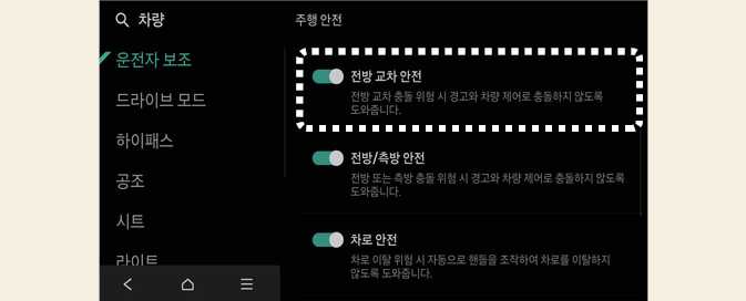 전방 교차 안전 (사양 적용시) OMV033121 시동 「ON」 상태에서 인포테인먼트 시스템의 설정 → 차량 → 운전자 보조 → 주행 안전 → 전방 교차 안전을 차례로 선택하십시오. 교차 차량 대응 기능이 켜집니다.