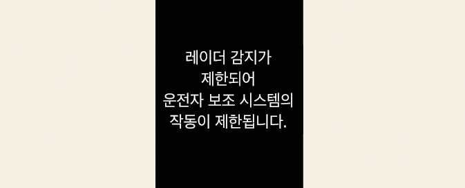 인식 센서 경고문이 표시되지 않거나 경고등이 켜지지 않더라도 후측방 충돌방지 보조가 정상적으로 작동하지 않을 수 있습니다.
