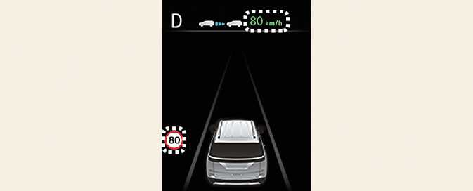 수동 속도 제한 보조 또는 스마트 크루즈 컨트롤 작동 시, 운전자가 설정속도를 도로의 제한속도에 맞추면 자동 설정속도 조절 기능이 활성화되며 클러스터의 설정속도가 초록색으로 표시됩니다. 이후 제한속도가 변경되면 여기에 맞춰 자동으로 설정속도를 조절해 줍니다.
