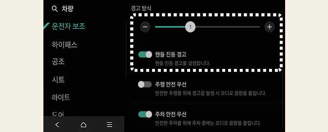 경고 음량과 핸들 진동 경고는 동시에 꺼지지 않습니다. 하나를 끄면, 다른 하나는 활성화됩니다.
