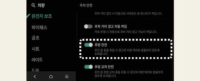 시동 「ON」 상태에서 인포테인먼트 시스템의 설정 → 차량 → 운전자 보조 → 주차 안전을 차례로 선택하십시오. 후방 주차 충돌방지 보조의 사용 여부를 설정할 수 있습니다.