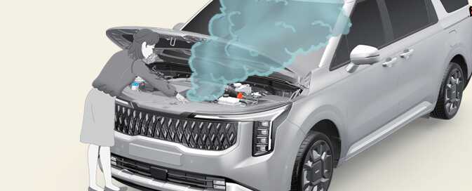 냉각수나 뜨거운 증기가 냉각수 탱크에서 흘러 나오면, 시동을 끄고 자사 직영 서비스센터 또는 서비스협력사에 연락하십시오. 냉각수가 흘러나오지 않으면, 엔진을 계속 돌게 한 상태에서 후드를 열어 엔진 실내에 통풍이 잘 되도록 하여 엔진을 식히십시오. 엔진이 회전되면서 수온계의 수온이 낮아지지 않으면 시동을 끄고 냉각되도록 충분한 시간을 기다리십시오.