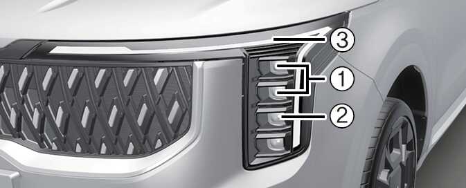 전조등(상향, 하향), 주간주행등의 전구 교체(헤드램프-A 타입) 그림 1. A 타입 OKA4H073058 LED 타입의 전조등(상향, 하향)(1, 2), 주간주행등(3)이 켜지지 않을 경우에는 가까운 자사 직영 서비스센터 또는 서비스협력사에서 점검을 받으십시오.