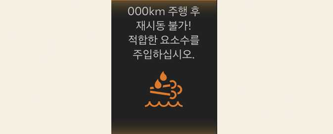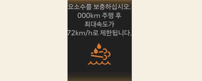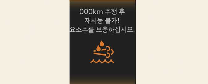 」과 함께 "요소수가 고갈되어 재시동이 불가합니다" 경고 메시지가 표시되며, 신속히 요소수를 보충하십시오. 요소수 보충 없이 주행하면 요소수 부족으로 재시동 시 시동이 걸리지 않을 수 있습니다. 주행 습관 및 도로 환경 등에 따라 표시된 주행 가능 거리와 실제 주행 거리는 달라질 수 있으므로 신속히 요소수를 보충하십시오.