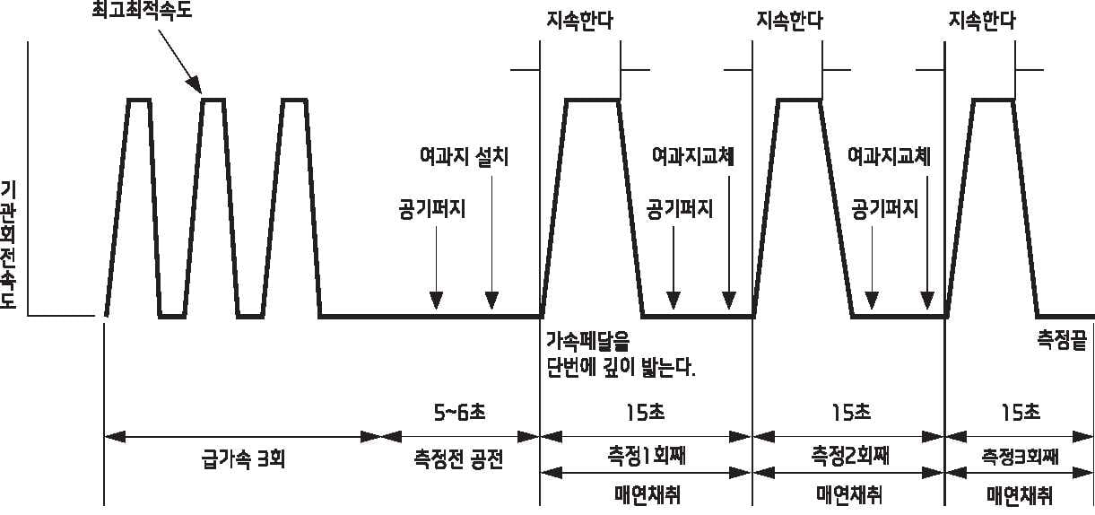 매연 측정 전 배기계에 쌓인 매연을 제거하기 위해 불어내기를 3회 실시합니다. (불어내기 방법은 공회전 상태에서 최고 회전 속도까지 2초 내 도달한 후 2초간 유지합니다. 다시 공회전 상태로 약 5~6초간 유지한 후 동일한 방법으로 불어내기를 총 3회 실시하십시오)