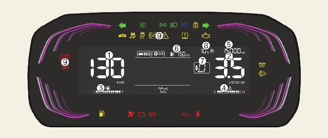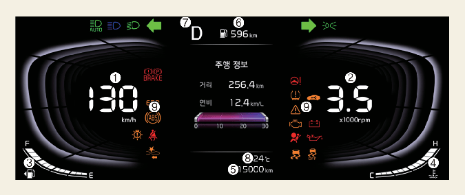 * 위의 그림은 설명을 위한 샘플로 실제 차량에 적용된 클러스터 형상과 다를 수 있습니다. 자세한 내용은 실 차량에 적용된 클러스터과 뒷장 설명 부분을 참고하십시오.