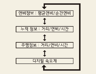 평균 연비 초기화(--.- km/L) 시점부터 현재까지의 주행 거리와 연료 소모량을 누적 계산하여 평균 연비를 표시합니다.
