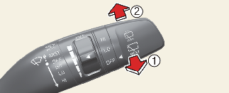 스위치를 운전자 방향으로 당기면 워셔액이 분출되면서 와이퍼가 수회 작동합니다. 스위치를 계속 당기고 있으면 당기고 있는 동안 와이퍼가 작동하면서 워셔액이 분출됩니다.