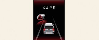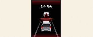 긴급 제동에 의한 정차 시 클러스터 등에 경고문이 표시됩니다. 안전을 위해 즉시 브레이크 페달을 밟고, 주변 상황을 확인하십시오.